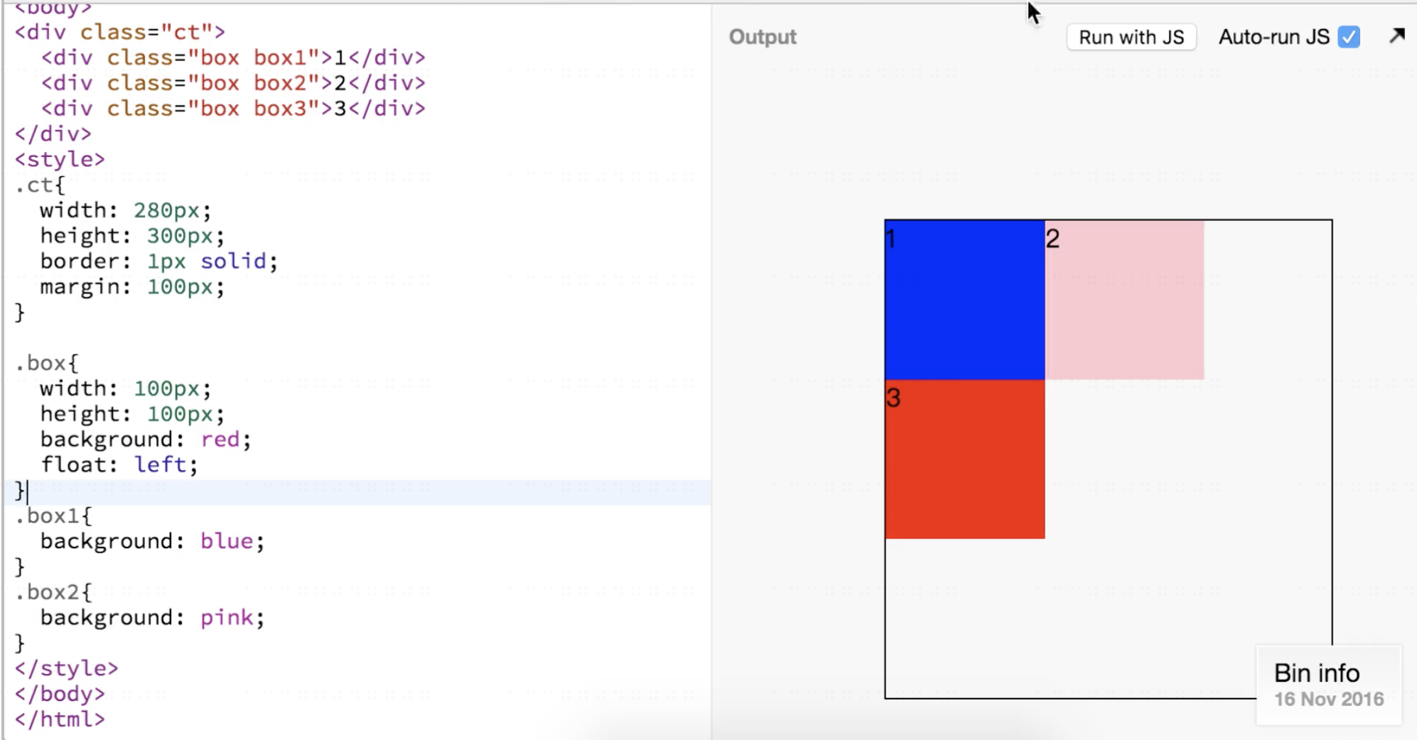 可以看到box原来为块级元素,本应该单独占据一行。但是设置左浮动之后,脱离文档流,依次向左移动。由于没有足够空间来让box3移动,便到了下一行。